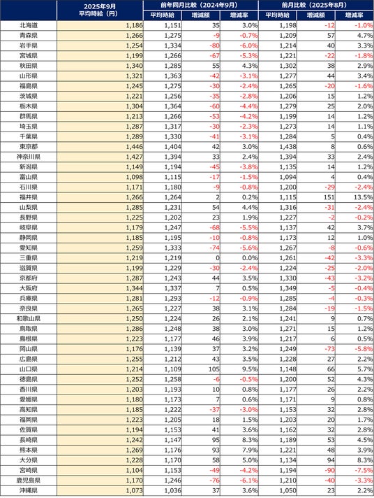 全国・前年同月比 時給上昇額TOP3(2025年9月度)