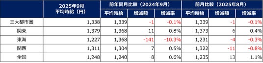 9月度のエリア別平均アルバイト時給は、関東、関西、全国で前年同月を上回る。