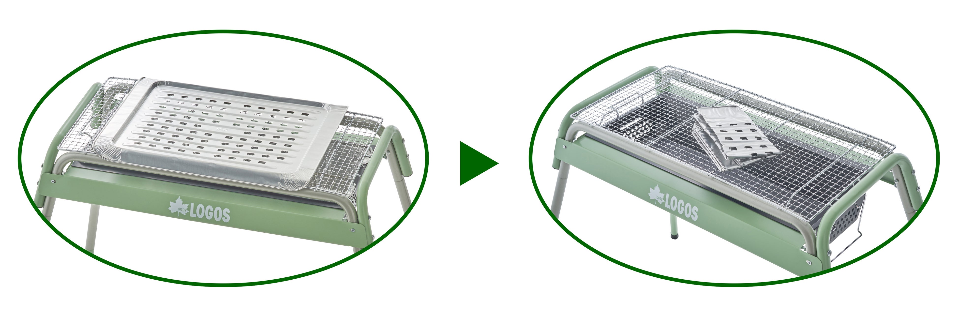 お手持ちのグリルのサイズに合わせ、プレートを切ったり両サイドを折り曲げてセット可能なため、小さなグリルでもズレずに使える。「LOGOS the ピラミッドTAKIBI」のゴトクにもセット可能。