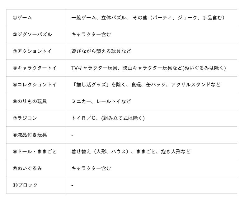 「キダルト(Kidult)」とは、「Kid(子ども)」と「Adult(大人)」を組み合わせた造語で、子どもの頃に親しんだ玩具やキャラクター、ホビーを大人になっても趣味として楽しむ人々を指します。近年では、キダルト層向けの商品が多様化・高品質化しており、国内外で注目を集める市場となっています。本調査では、玩具売場におけるキダルトの実態を深堀するため、キダルトの定義を「過去1年以内に自分用に玩具を購入したことがある」「購入した商品に子どもを主ターゲットとした下記11カテゴリの商品が含まれる」のいずれにも該当する大人としています。