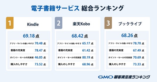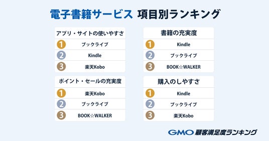 GMOインターネットグループで、インターネットリサーチ事業を展開するGMOリサーチ&AI株式会社(代表取締役社長:荻田 剛大 以下、GMOリサーチ&AI 略称:GMO-R&AI)は、2025年10月15日(水)に同社が運営する「GMO顧客満足度ランキング」において、2025年の「電子書籍サービス」(※1)カテゴリのランキング結果を公開しました。同カテゴリの総合ランキングでは、Kindleが1位に輝きました。