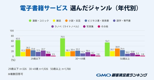 29歳以下では、「語学・専門書」「ラノベ(ライトノベル)」の回答率が他の世代と比較して5.0ポイント以上高く、「電子書籍サービス」を広く活用している様子がうかがえます。また、30~49歳では、「小説・文芸」が他の世代と比較して7.8~10.5ポイント低い結果となり、世代間での利用傾向の違いが明らかになりました。