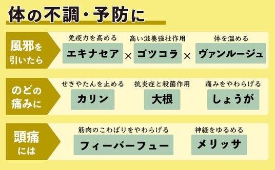 風邪の予防、のどのケア、胃痛、便秘、花粉症、冷え性ほか