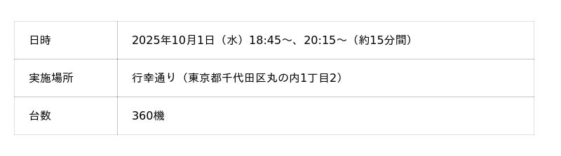 本キャンペーンの特別協力として実施した行幸通りでのドローンショーでは、特別ゲストとして登壇した小池百合子東京都知事とともにカウントダウンを行い、360機のドローンが東京駅を背景として丸の内のビルの間に舞いました。なお、行幸通りでドローンショーが行われるのは史上初めてとなります。