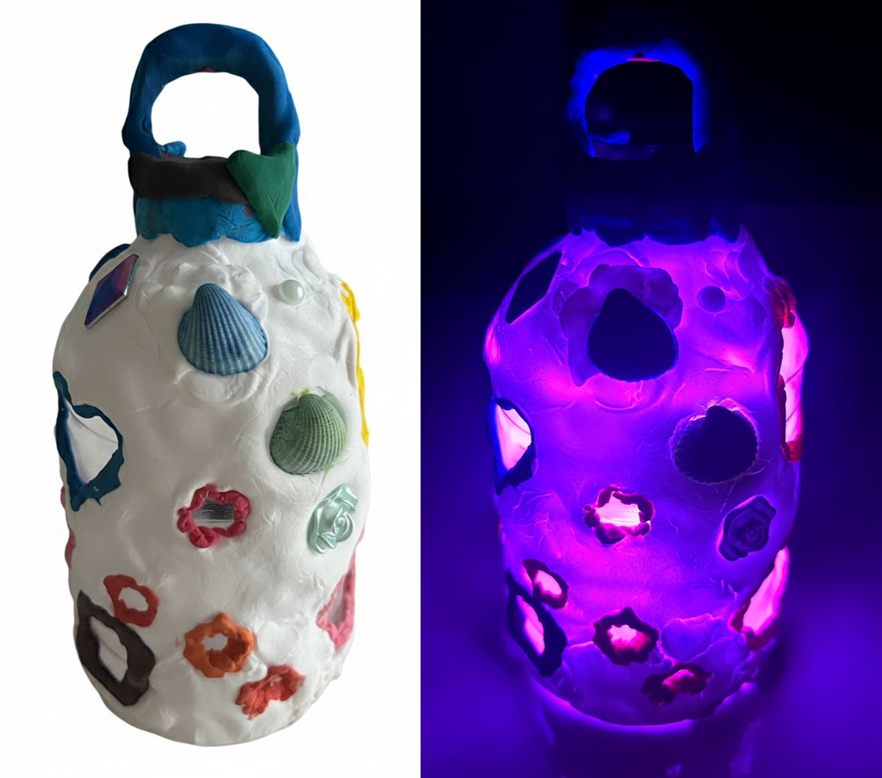 亡くなったご家族へのあたたかい想いが、作品からあふれ出してくるような、とても心のこもった提灯ですね。真っ白な粘土で包まれた提灯には、色とりどりの貝殻や、たくさんのカラフルな模様が散りばめられています。