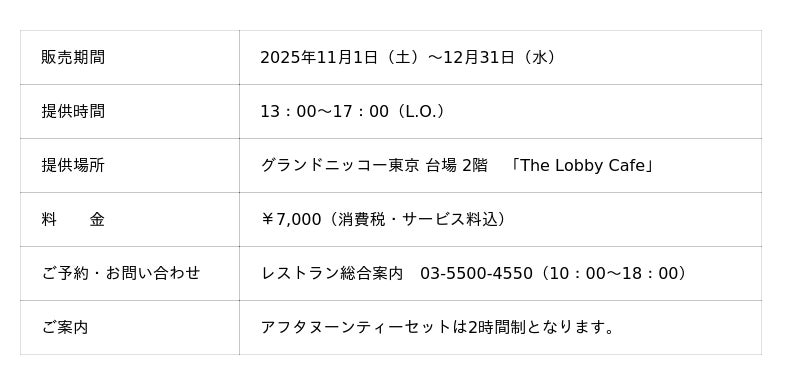 「東京を楽しむ 東京をくつろぐ」ひとときをお届けするグランドニッコー東京 台場(住所:東京都港区 総支配人:塚田 忠保)は、吹き抜けのロビーフロアに心地よい光が降り注ぐ「The Lobby Cafe」にて、冬の訪れにふさわしいホワイトカラーを基調とした『ホワイトアフタヌーンティーセット』を2025年11月1日(土)~12月31日(水)の期間限定で提供いたします。