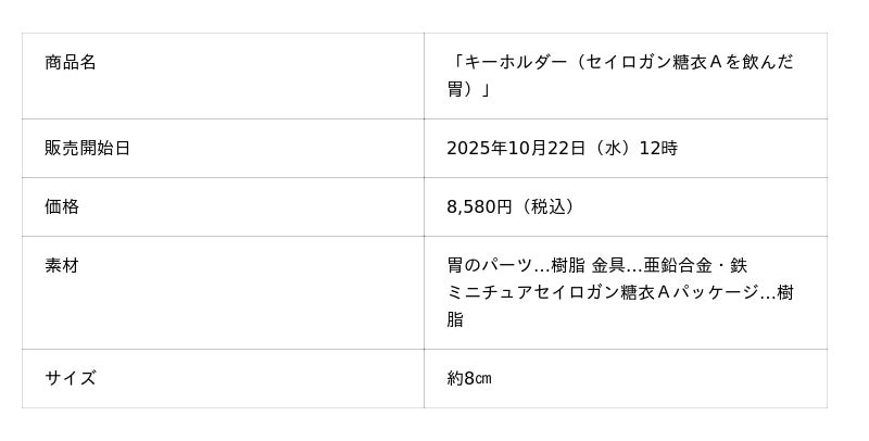 今回はオリジナルグッズ第一弾として、キーホルダー2種、ぬいぐるみ1種を販売いたします。キーホルダーはハンドメイドアクセサリー作家「Rebecca」氏によるデザインで、一点一点手作業で制作しています。液体入りの胃の形をモチーフにしたチャームと、ミニチュアの『正露丸』『セイロガン糖衣A』、「大幸薬品」のロゴプレートを組み合わせた仕様です。胃の形のチャームの中には、透明な液体とそれぞれ『正露丸』の丸剤、『セイロガン糖衣A』の錠剤をイメージした粒が入っており、傾けるとゆっくりと動きます。ぬいぐるみは『正露丸』のパッケージをキャラクター化したデザインで、座らせて置けるため、ご家庭の好きな場所に飾って楽しむことができます。