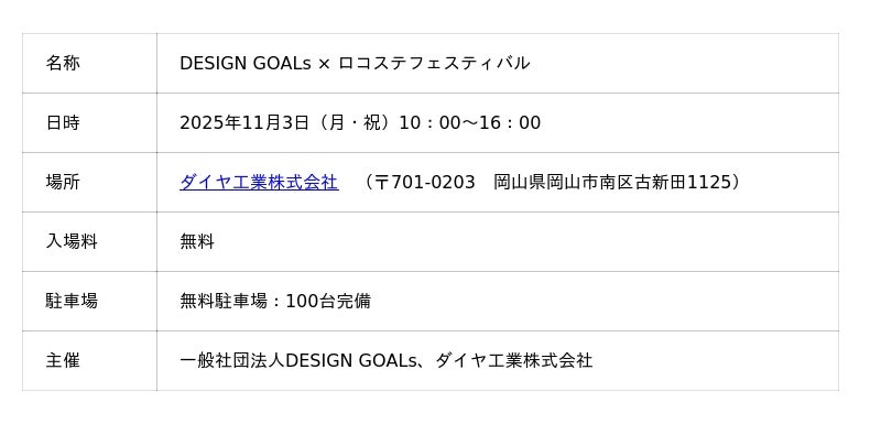 医療用品メーカーのダイヤ工業株式会社(本社:岡山県岡山市 代表取締役:松尾浩紀)は、この度、一般社団法人DESIGN GOALs(本社:岡山県岡山市)と共催で、「DESIGN GOALs × ロコステフェスティバル」を2025年11月3日(月・祝)にダイヤ工業株式会社の本社にて開催いたします。健康・運動、アート、SDGsをテーマに多様な人・企業が総勢50店舗集結する地域共創イベントです。子どもから大人までお楽しみいただけるたくさんの企画をご用意しております。皆様のご来場を心よりお待ちしております。