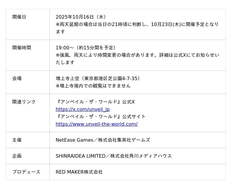 本ドローンショーは、NetEase Gamesと株式会社集英社ゲームズが共同開発する新作スマホゲーム『unVEIL the World -アンベイル ザ ワールド-』の世界観をモチーフにした特別な演出を行います。ゲーム内で描かれる“巨塔”をはじめ、様々なキャラクターを約500機のドローンで再現し、増上寺から芝公園方向の上空に幻想的かつスケール感あふれる光のアートを展開します。RED MAKER株式会社 が総合プロデュース、運航をAlterSkyが担当します。