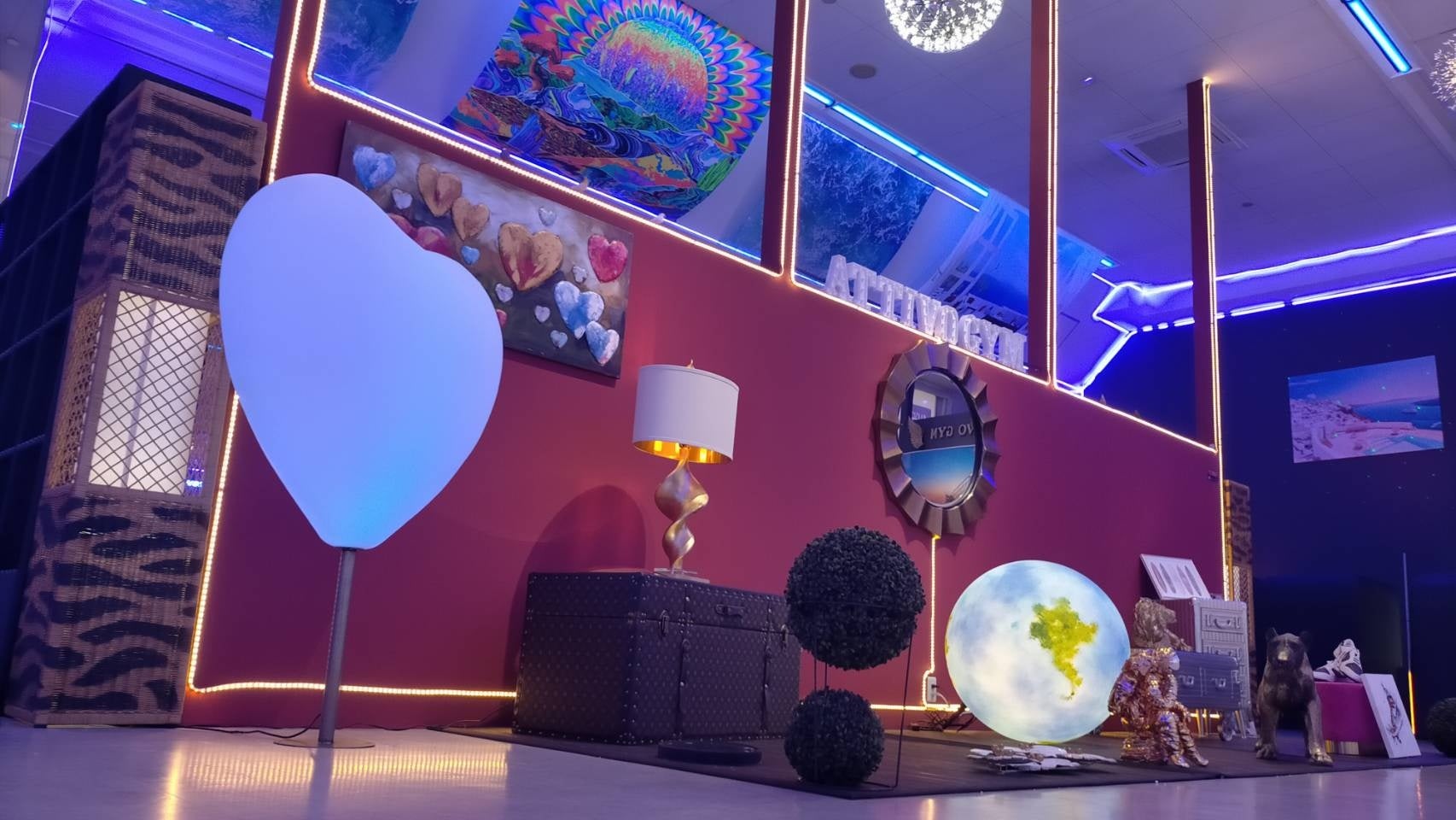 館内には、海辺の開放感を演出する ビーチパラソルや柔らかな照明 が並び、シーサイドリゾートを再現。さらに一歩踏み入れると、ブルー×レッドの幻想的な光に包まれた“惑星空間”が広がります。