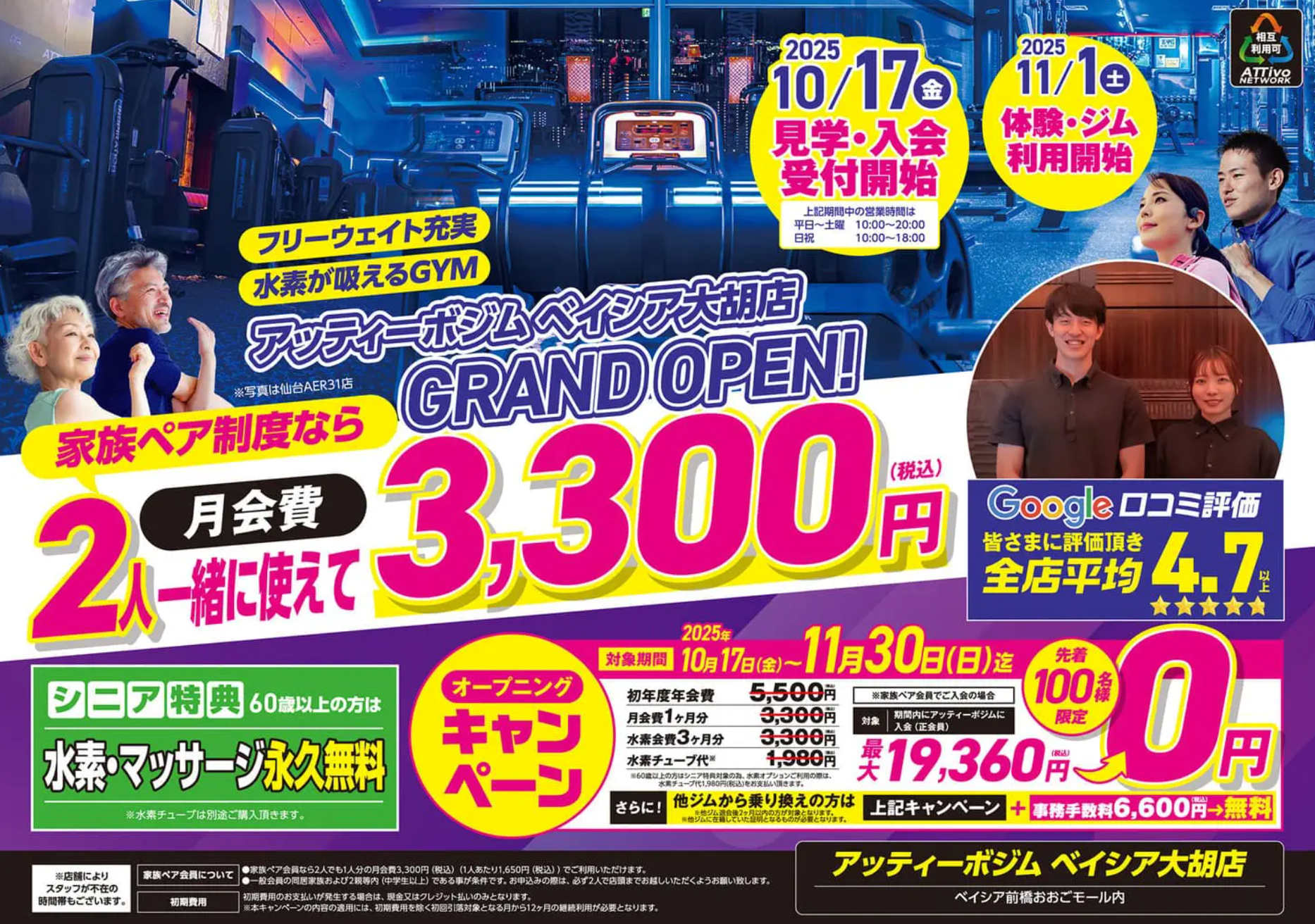 株式会社ジーズニューコンセプト(本社:宮城県仙台市、代表 佐藤浩至)が運営する「ATTivoGYM(アッティーボジム)」は、10月17日(金)、「ベイシア前橋おおごモール」内に新店舗をオープンします。