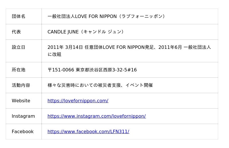 2011年3月11日東日本大震災を受け発足した一般社団法人 LOVE FOR NIPPON (代表:CANDLE JUNE、所在地:東京都渋谷区、以下:LFN)は、「できることは全部やる」を掲げ、様々な支援者と現地を繋ぎ、お互いが笑顔になってもらうための活動をおこなってきました。2024年1月、能登半島沖地震発災の翌日より現地へ入り、炊き出しや物資提供、泥かきなどの支援活動を実施。現在も月命日である毎月1日を中心に仮設住宅などでライブやキャンドルナイトのイベントを開催して、現地の方との交流を続けています。