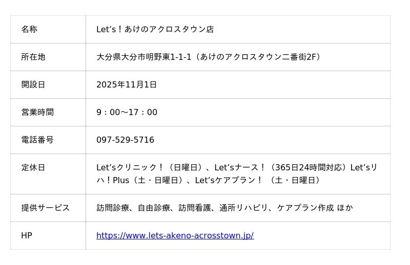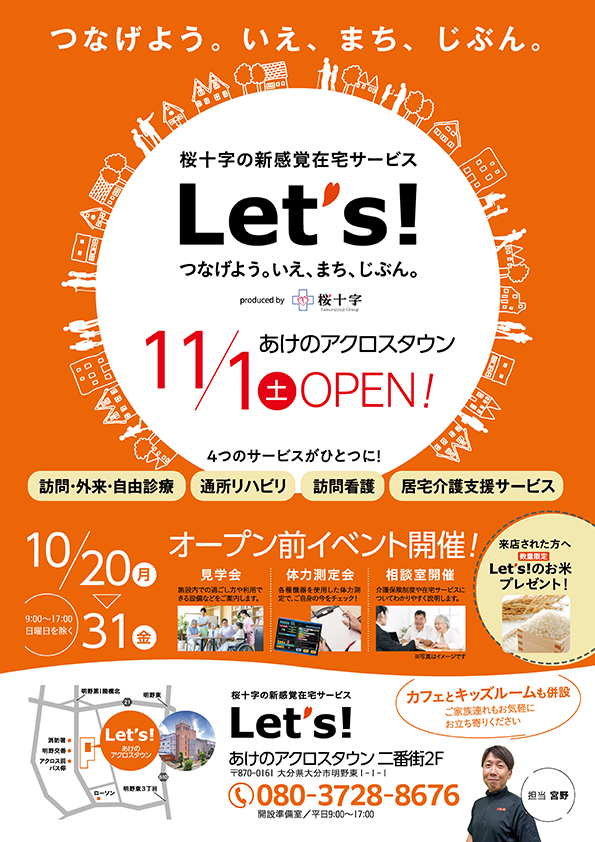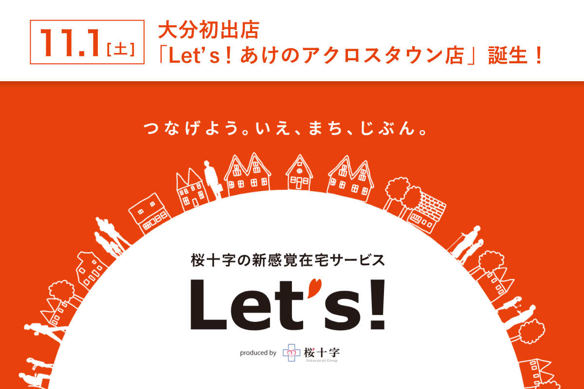 医療・介護・予防医療を軸にウェルビーイング・フロンティアを目指す桜十字グループは、2025年11月1日(土)、大分県大分市の複合商業施設「あけのアクロスタウン」内に、在宅サービス「Let’s!」の新店舗をオープンいたします。1.訪問診療や外来診療(痩身・アンチエイジングなど)を行うクリニック、2.通所介護(デイケア)、3.訪問看護、4.居宅介護支援事業所を、大分市民の憩いの場、生活の中心地である「あけのアクロスタウン」に統合し、人生100年時代に向けた新しい医療・介護のサービスを提供してまいります。
