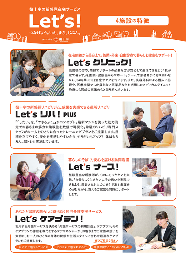 桜十字の新感覚在宅サービスLet’s! あけのアクロスタウン店は、「利便性と連携を重視した地域包括ケアの新しい形」を提案し、「まちの中に、ケアがある。」という新しい日常を創ります。