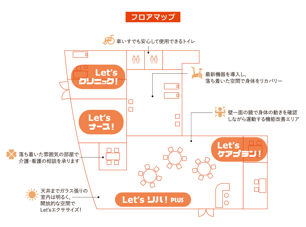 訪問診療(Let’sクリニック!)、訪問看護(Let’sナース!)、通所リハビリ(Let’sリハ!plus)、居宅介護支援(Let’sケアプラン!)など、複数の在宅サービスを一つの拠点で提供。必要なケアをワンストップで受けられます。