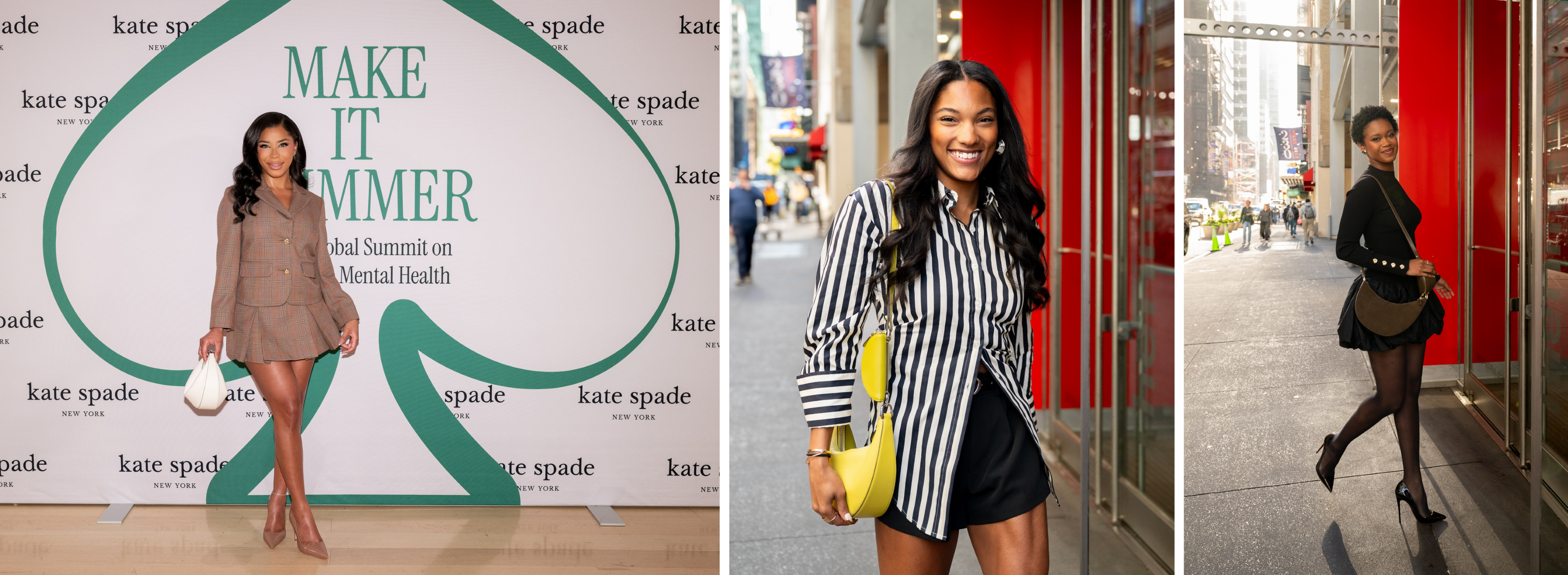 左から:アマヤ “パパイヤ” エスピナル KSDuo Crossbody Bag in Cashew Milk, while wearing the Plaid School Girl Blazer and Plaid Box Pleat Mini Skirtを着用、タラ・デイビス・ウッドホール KSDuo Crossbody Bag in Lime Sliceを着用、ジョイ・ウッズ KSDuo Crossbody Bag in Burnt Sageを着用。ケイト・スペード ニューヨークの女性のメンタルヘルスのためのグローバルサミットにて。Photo Credit: Darian DiCianno/BFA.com