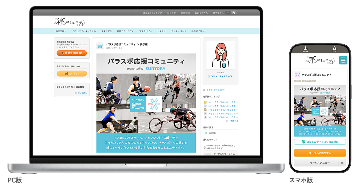 「パラスポ応援コミュニティ Supported by SUNTORY」が開設された「“絆”のコミュニティ」は2020年1月にオープンした、クオンが運営するオンライン上のファンコミュニティプラットフォームです。70以上の企業・自治体と200万人を超える生活者が集い、“絆”をテーマにした交流や、参画企業・団体のコラボレーション企画、双方向コミュニケーションから生まれる生活者の声をもとにした価値共創のイベントなどを実施しています。
