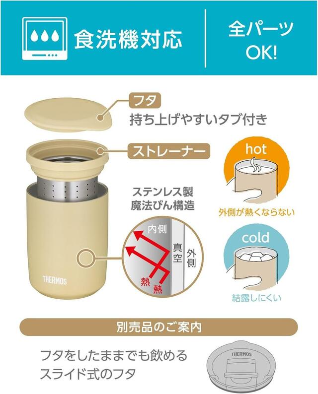 サーモスといえば、やはり真空断熱構造。このモデルも例外ではなく、熱い飲みものを入れても外側が熱くならず、冷たい飲みものを入れても結露しにくい設計です。