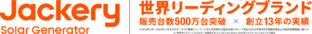 2012年、アメリカ・カリフォルニア。「グリーンエネルギーをあらゆる人に、あらゆる場所で提供する」という、壮大なビジョンのもと、私たちJackery は、誕生しました。2016 年には、ブランド初となるアウトドア用ポータブル電源を発売。さらにその2 年後には、ブランド初のポータブルソーラーパネルを開発しました。