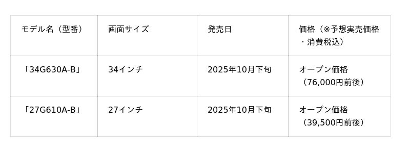 LGエレクトロニクス・ジャパン株式会社(代表取締役:孫 成周(ソン・ソンジュウ)、本社:東京都中央区)は、ゲーミングモニターシリーズ「LG UltraGear(TM)」の新モデルとして、34インチの「34G630A-B」と、27インチの「27G610A-B」を、2025年10月下旬より順次発売します。