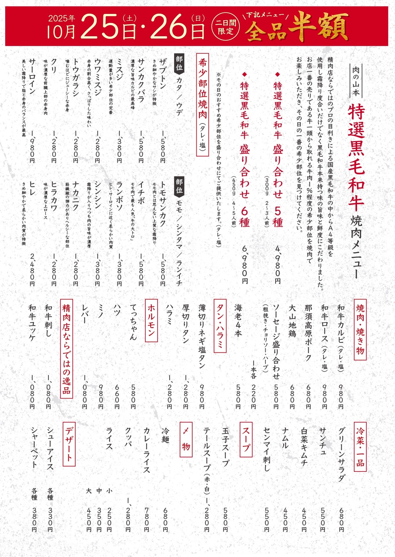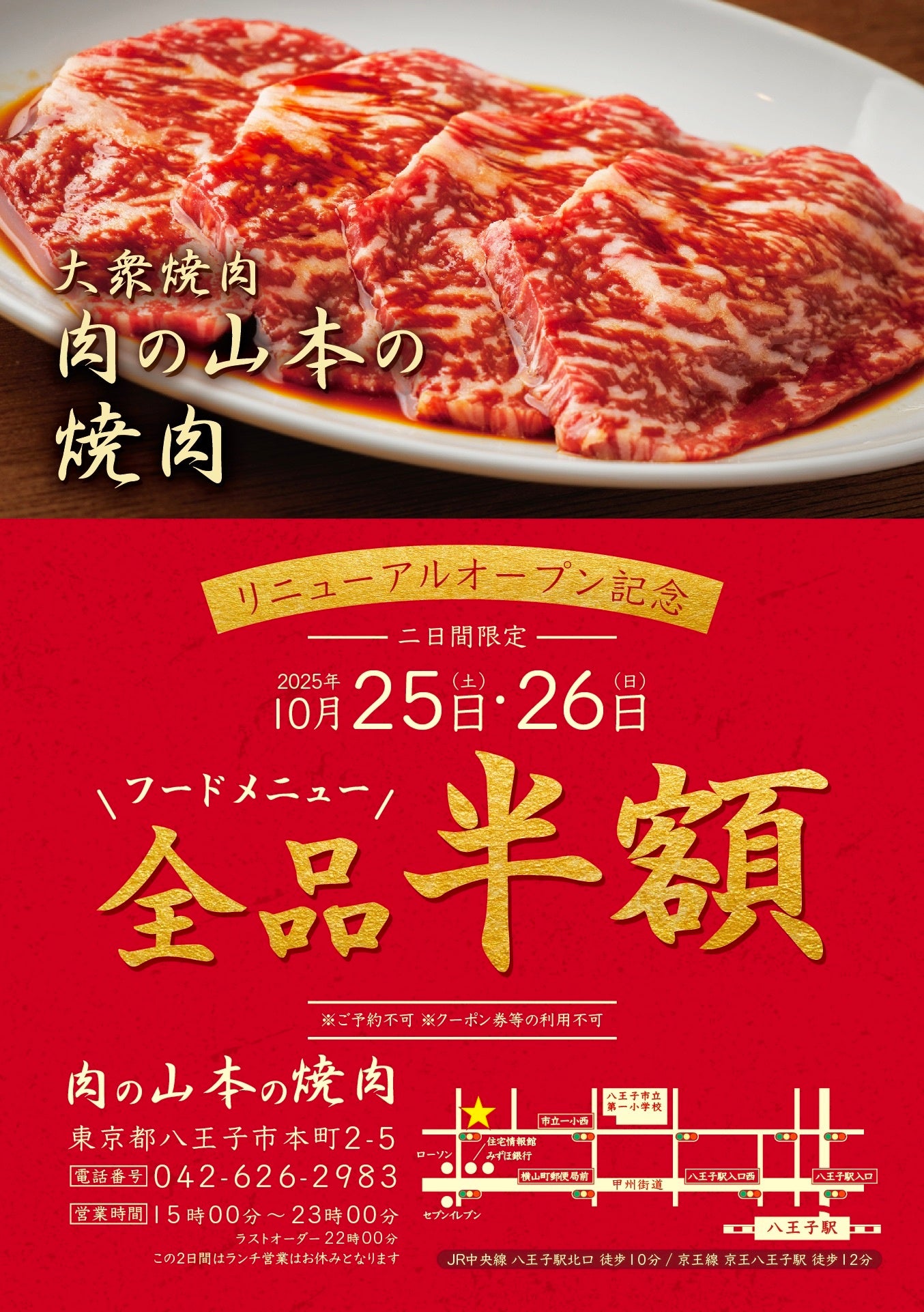 10月16日(木)に新装開店を迎える「肉のやまもとの焼肉」は、リニューアルオープンを記念した特別イベント『フードメニュー全品半額祭』を開催いたします。
