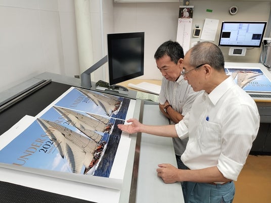 『UNDER SAIL 2026』を印刷した平河工業社で刷り具合を確認する矢部洋一さん(奥)。手前は同社でプリンティングディレクターを務める“網点の魔術師”桐原淑郎さん。撮影と印刷という二人のハイレベルな技術の融合により、素晴らしいカレンダーが仕上がりました