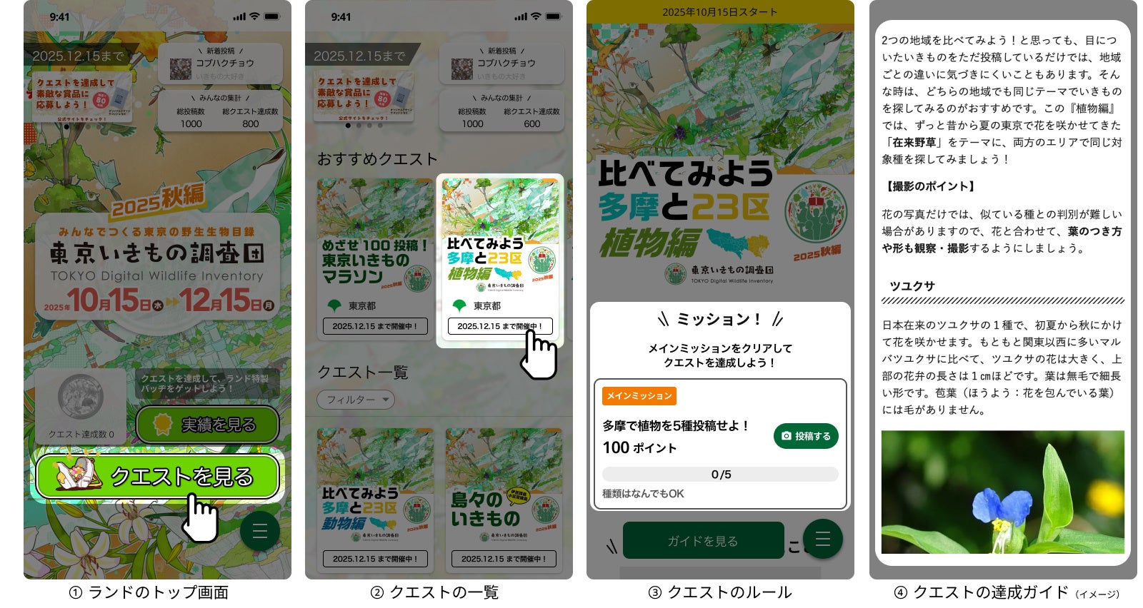 秋編は、本プロジェクトの一環として開催される大型イベントのひとつです。調査期間中は、ゲーム感覚でいきもの調査ができる「クエスト」や、都内で2回開催される現地イベントを通して、いきものの魅力について多様な角度から体験することができます。「東京いきもの調査団」の一員となって、ぜひ本調査イベントにご参加ください。