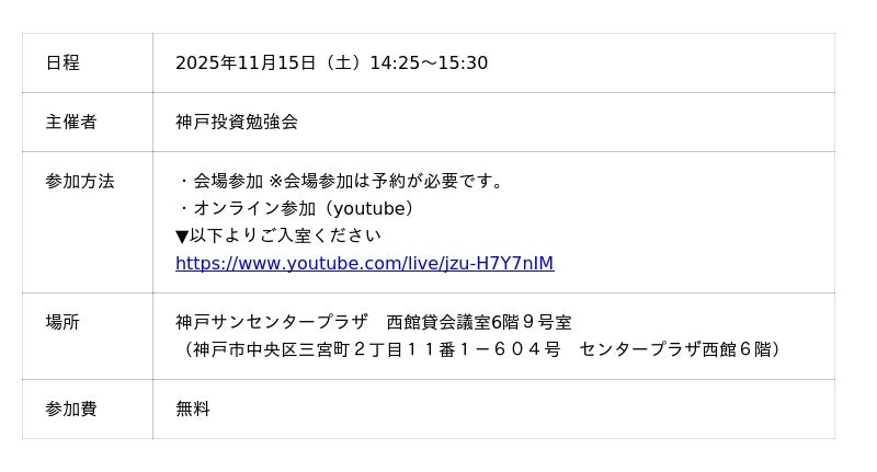 セレンディップ・ホールディングス株式会社(本社:名古屋市中区、代表取締役社長兼CEO:竹内 在 以下、当社)は、2025年11月15日(土)に神戸(三宮)+オンラインにて開催される「神戸投資勉強会」の個人投資家向けIR説明会に参加しますので、下記の通りお知らせいたします。