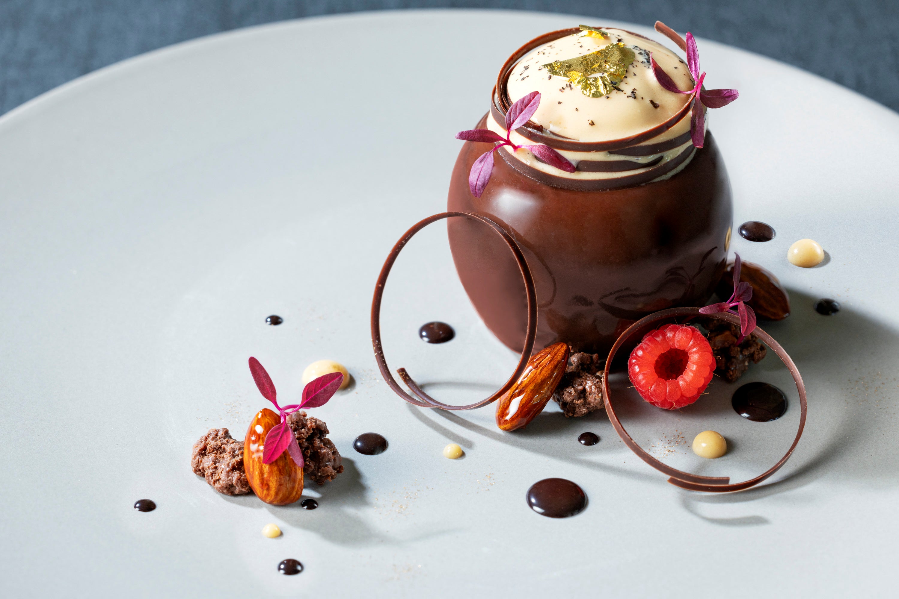 コースの最後を締めくくるデザート「オペラのアントルメグラッセ ルビーチョコレートのクレームブリュレ」は、ほろ苦いコーヒーが香り立つフランス菓子の「オペラ」と彩り豊かなルビーチョコレートのブリュレでクリスマスツリーを表現しています。美しい盛り付けとともに、カンナならではの創作料理をぜひお楽しみください。