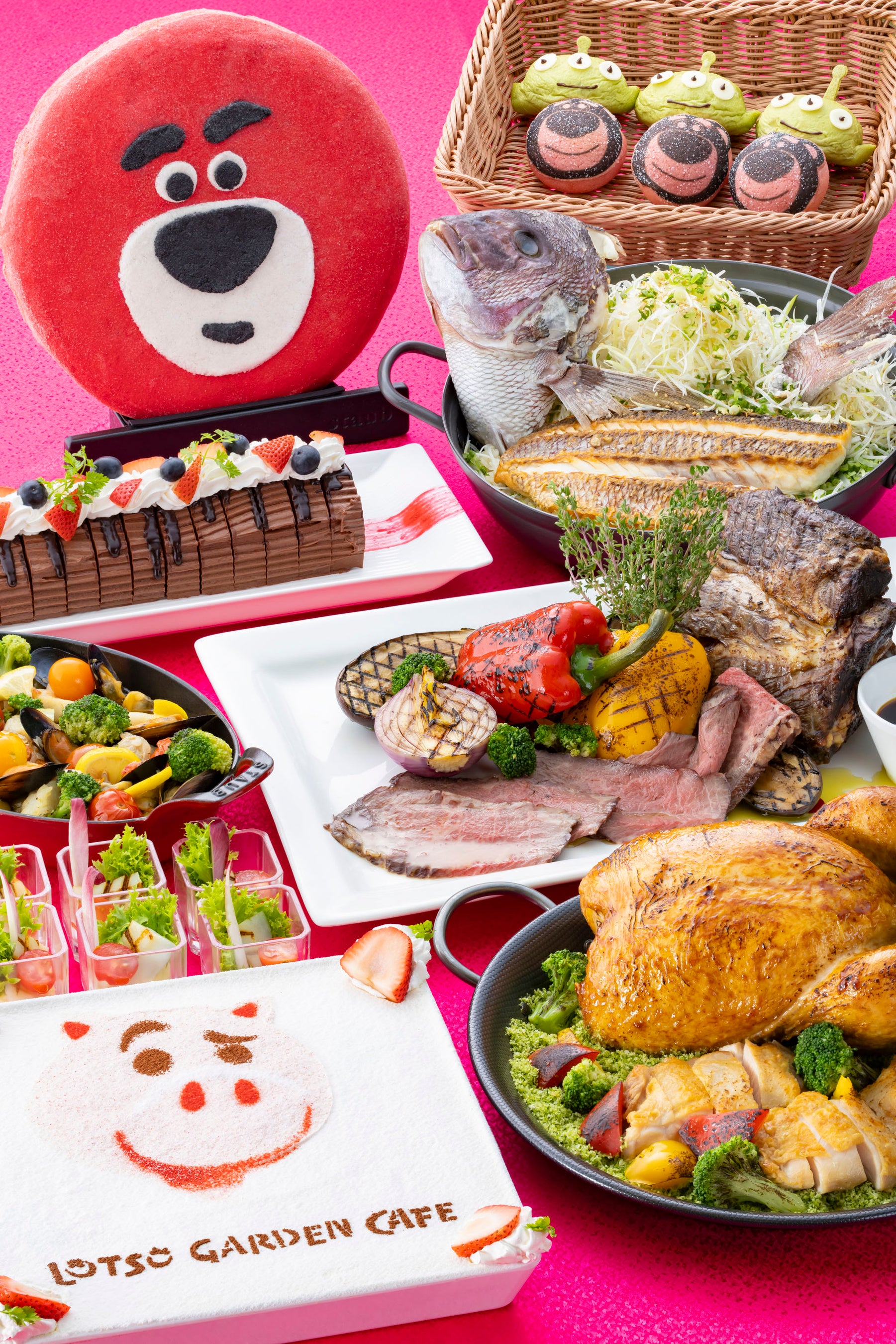 肉の旨みを閉じ込めながら低温で丁寧に焼き上げたローストビーフや鯛を贅沢に混ぜ込んだ鯛めしなど、華やかなメニューがブッフェ台を彩ります。鯛めしは、そのままはもちろん、お好みに合わせて出汁をかけ、お茶漬け風にしてもお召し上がりいただけます。また、レギュラーメニューとしても提供している「リトルグリーンメン」をイメージしたほうれんそうパンは、チョコレートソースで自由にデコレーションをして、自分だけの一品に仕上げられます。
