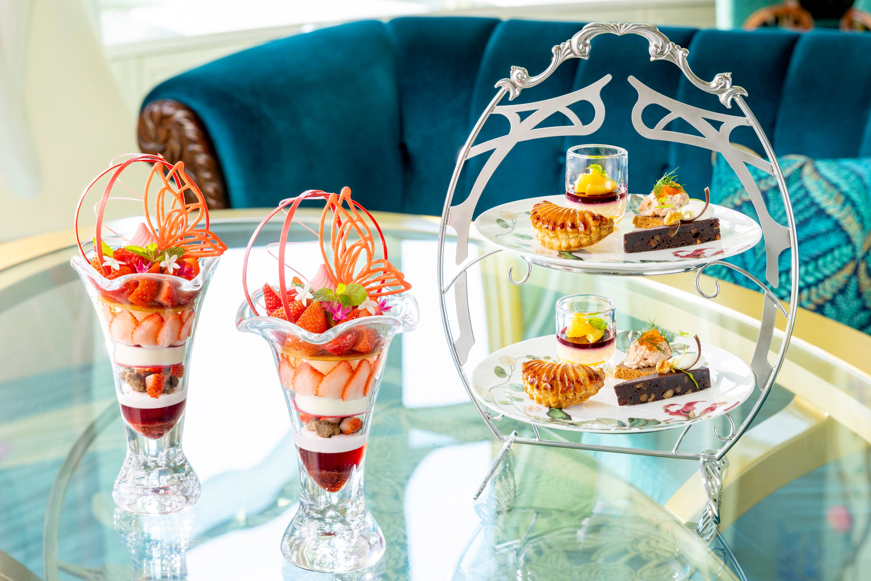 スタンドに美しく並べられたアペタイザーには、ナッツをたっぷりと使いしっとりと焼き上げたブラウニーや、シナモンが香るリンゴの果肉を包み込んだショソン・オ・ポムをご用意しています。メインデザートの苺のパフェは、苺の甘酸っぱさとアマレット風味のパンナコッタの優しい甘味が口いっぱいにひろがるこだわりの逸品です。開放感のあるロビーラウンジで、心ときめく夢のような時間をご体験ください。