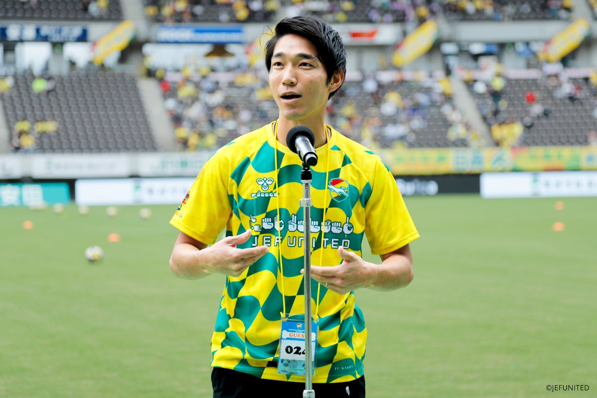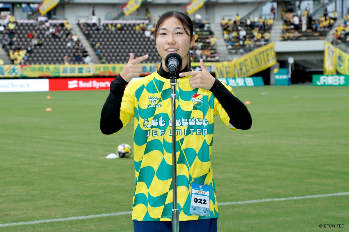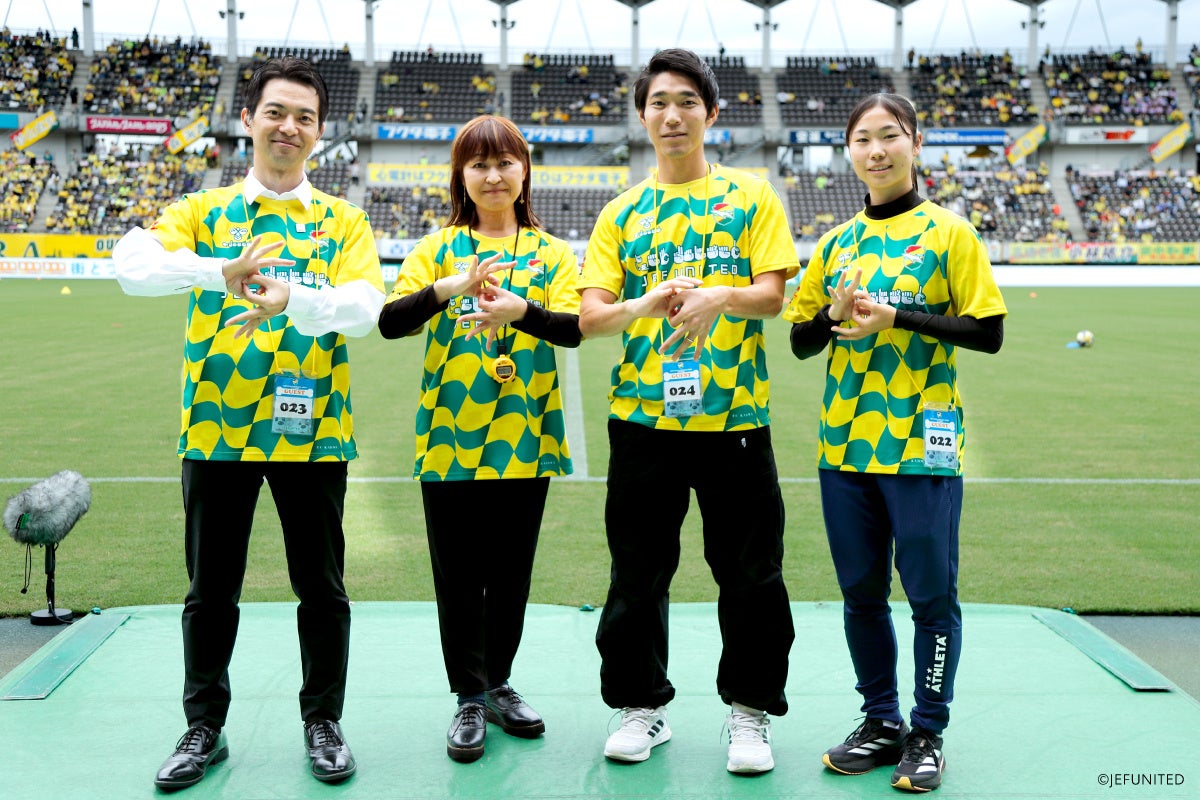 ジェフユナイテッド市原・千葉による手話シャツは、販売の売上の一部と選手着用のチャリティーオークションの売上すべてを聴覚障がい者支援に活用。寄付先のひとつでもあるデフサッカー日本代表から、千葉県にゆかりのある男子代表の岡井舜選手と女子代表の高木桜花選手が来場。スタジアムDJの酒井道代さんが、「手をひらひらとさせる手話の拍手で迎えましょう」と話すと、スタンドから星が瞬くように手が振られた。