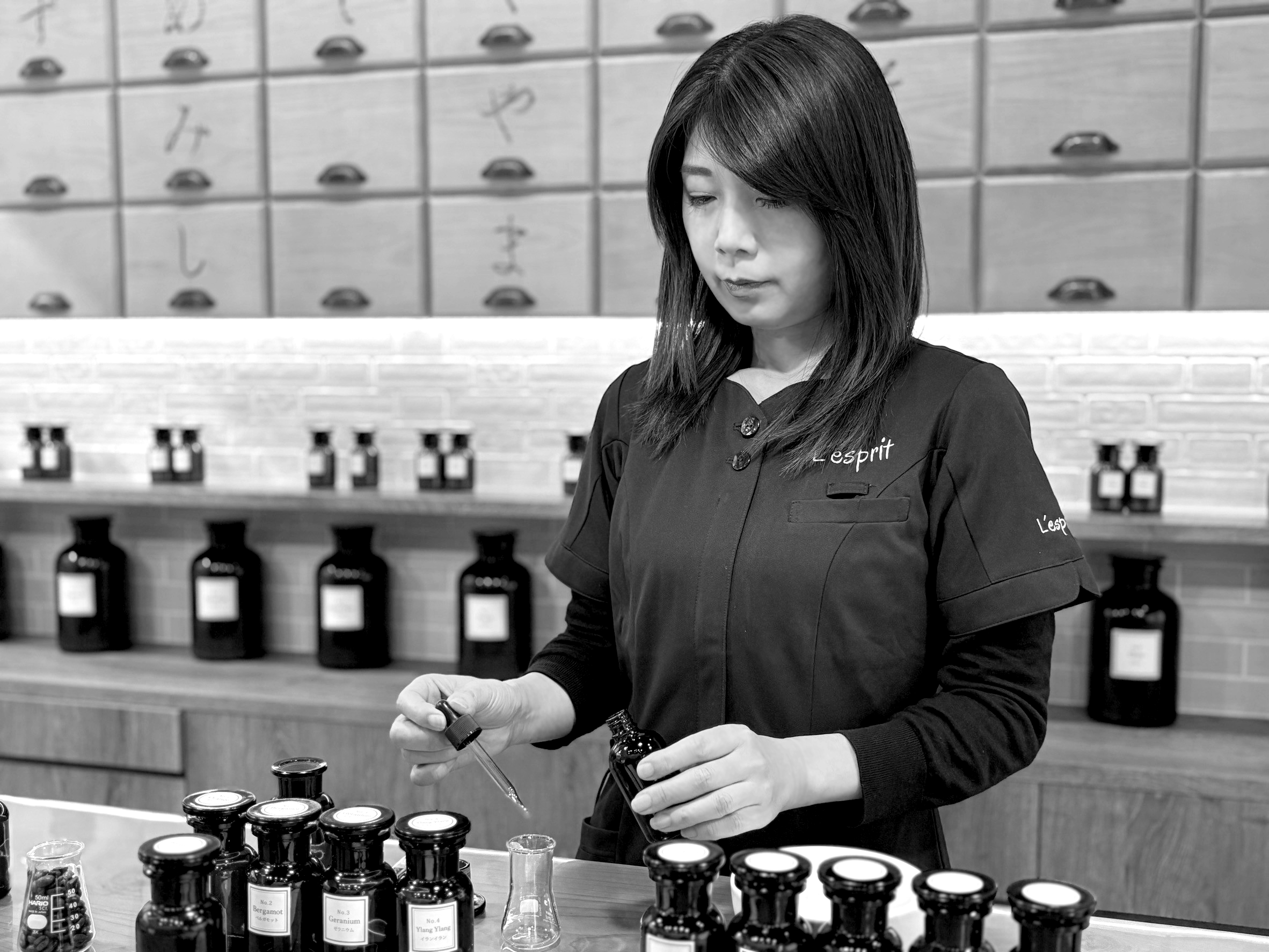 短大卒業後、本格的にアロマセラピーを学び、香りの魅力にハマる。アロマセラピー会社に転職後、精油のブレンド業務に従事。10年程前に当社入社後は、当社専属アロマデザイナーとして精油に関わる豊富な経験を活かし、数々の商品開発に従事。2024年11月から調香体験香房 L’esprit(レスプリ)のショップマネージャーも兼任し、12月より現職。