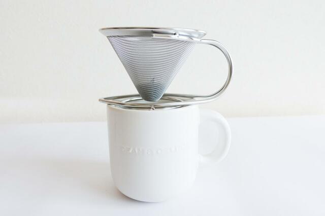 ドリッパーをマグカップに載せます。カップの飲み口は直径8.5cmぐらいです。