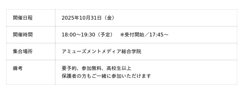 エンタメ業界のプロを育成するアミューズメントメディア総合学院(東京都渋谷、理事長:吉田東吾、以下AMG)は、野中民美代さんをゲストに迎え、体験型オープンキャンパスを10/31(金)に実施いたします。