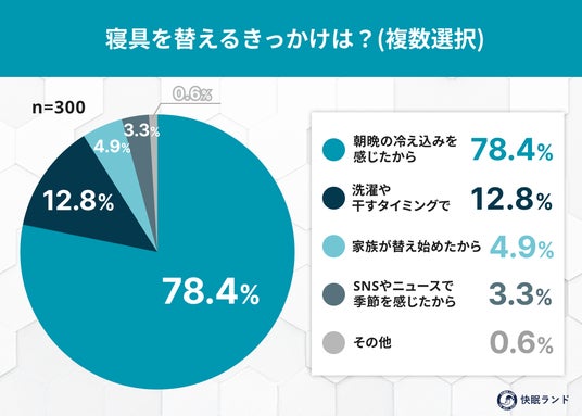 - 冬用寝具への切り替えは「11月」が最多で48.0%、次いで「10月」が41.3%- 寝具を替えるきっかけは「朝晩の冷え込みを感じたから」が78.4%で圧倒的多数