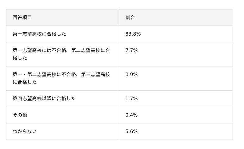 「高校受験を成功させるには、塾に通うのが当たり前」という風潮に一石を投じる結果が出ました。今回の調査では、塾や家庭教師を利用せずに2025年度の高校受験を終えたお子様を持つ保護者に受験結果を尋ねたところ、実に83.8%が「第一志望高校に合格した」と回答しました。「第一志望高校には不合格、第二志望高校に合格した(7.7%)」と合わせると、91.5%が第二志望までの高校に合格しており、塾なしでも極めて高い確率で志望校への進学を実現していることがわかります。