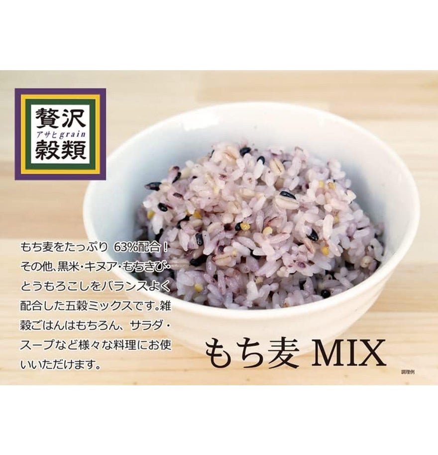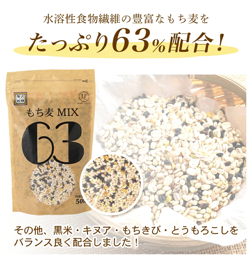 もち麦を63%配合し、黒米・キヌア・もちきび・とうもろこしをバランス良くブレンド。