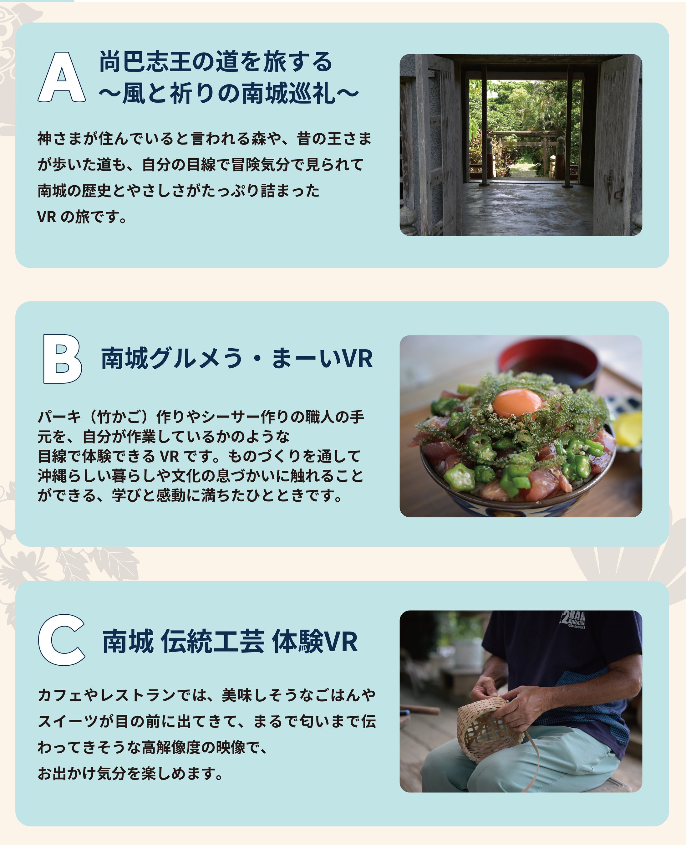 ・「尚巴志王の道を旅する~風と祈りの南城巡礼~」など3種類のVRコンテンツを常設。