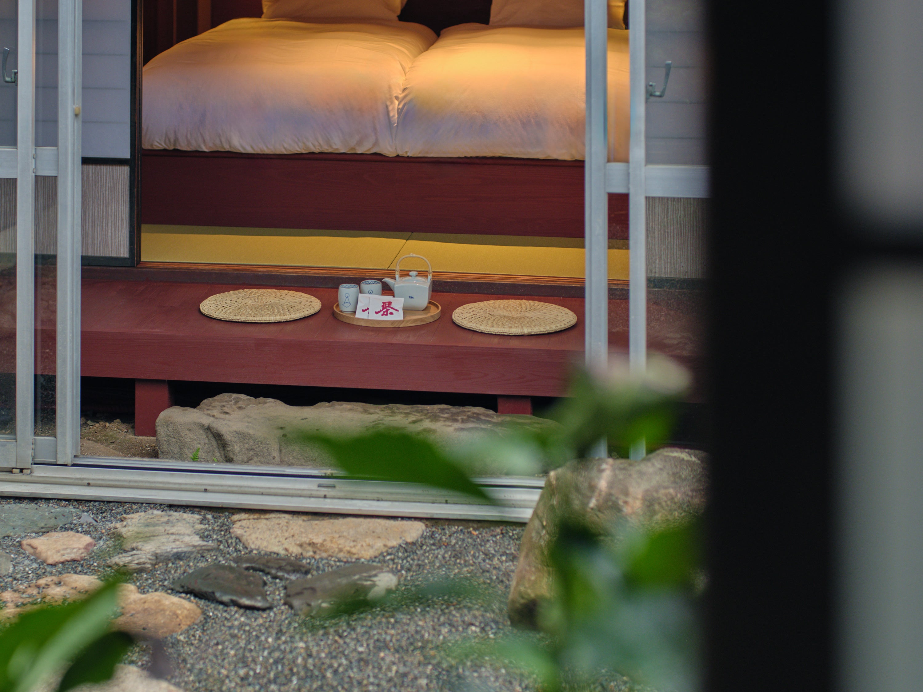 Komado ベンガラは、小松市の中心部で町衆文化が今も息づく龍助町にあります。町家を改修してつくられた3つの客室では、この町の息遣いを感じられます。客室の窓の先に広がるのは、季節の移ろいを感じる中庭や、格子越しの通りの町の気配、瓦屋根の景色など、それぞれ異なる小松の日常風景。受け継がれてきた文化と新たな感性が静かに交わる空間で、ゆったりとした時間を過ごすことができます。