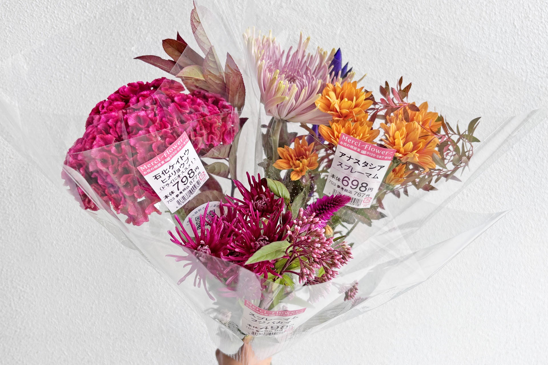 メルシーフラワーではご紹介した以外の旬のお花も新鮮な状態で仕入れ、手に取りやすい価格でスーパーマーケットのお花売り場にお届けいたします。お花をインテリアとして取り入れ、ご自宅などで気軽に“秋の彩り”を楽しんで頂けたらと思います。※お花の色、種類は店舗によって異なります。
