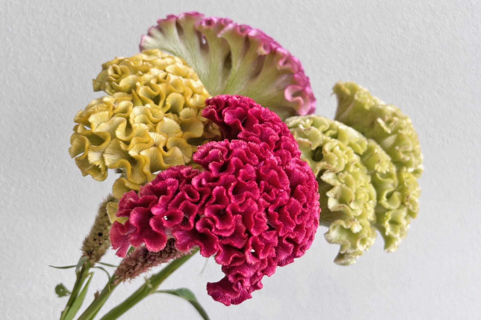 【石化ケイトウ】…ベルベットのような美しい光沢と質感、ダイナミックな花姿が個性的です。