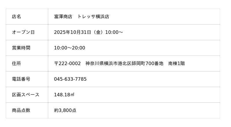 日本最大級の製菓・製パン材料、器具専門店として創業106年の株式会社富澤商店は、2025年10月31日(金)に「富澤商店 トレッサ横浜店」をグランドオープンいたします。横浜市内9店舗目となる本店舗は、市内最大の売り場面積を誇り、より豊富な商品ラインアップと快適なショッピング空間をご提供いたします。オープンを記念して、10月31日(金)~11月3日(月・祝)の4日間限定で特別企画を実施。限定商品やお得なセット商品など、多数ご用意しています。