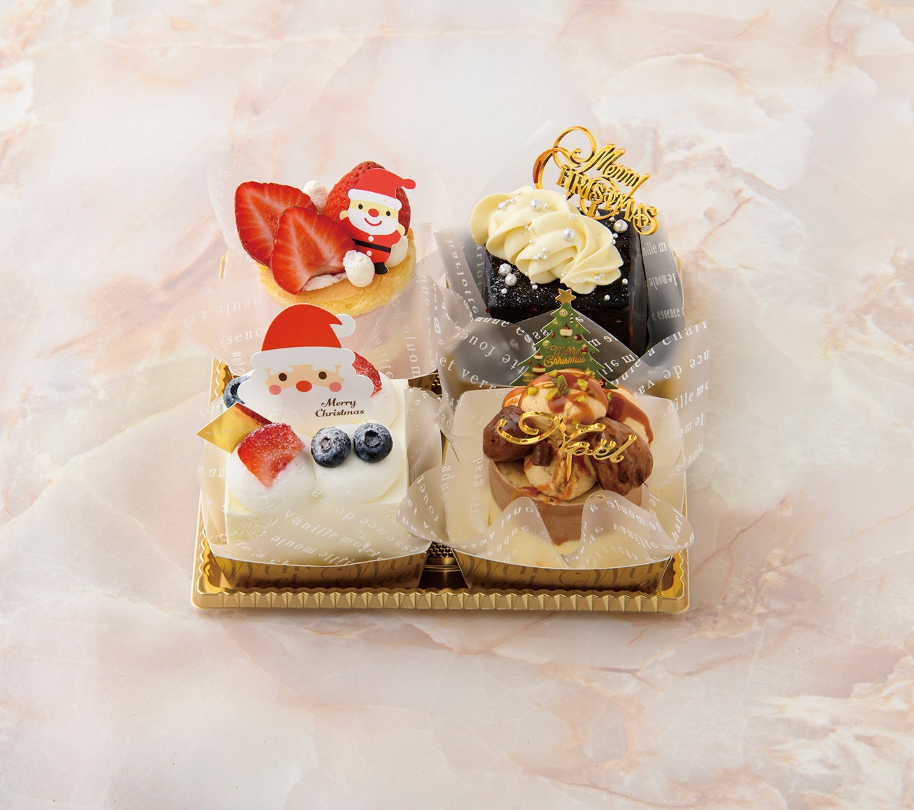 西武福井店では10 月17日(金)から12月17日(水)の期間、クリスマスケーキの受注予約を行います。昨年は平日 クリスマスや物価高の影響で、小分けできるケーキや小さいサイズのケーキがそごう・西武全店のランキング上位にあがるなど人気でした。今年も平日クリスマスであることに加え、続く物価高で節約志向の意識が高まっていることを受けて、 いろいろな種類を楽しめるアソートケーキを拡充して展開いたします。一方でクリスマスケーキも二極化しており、節約ムード 高まる中でも、年末年始は贅沢をしたいという声にも対応し、フルーツをたっぷり使ったケーキや有名パティシエのケーキなど、クリスマスを華やかに彩るケーキを展開いたします。 地元人気パティシエたちによる、こだわりあふれる贅沢なオリジナルアソートケーキもご紹介。4人のパティシエたちのスイーツを一度に味わえる
