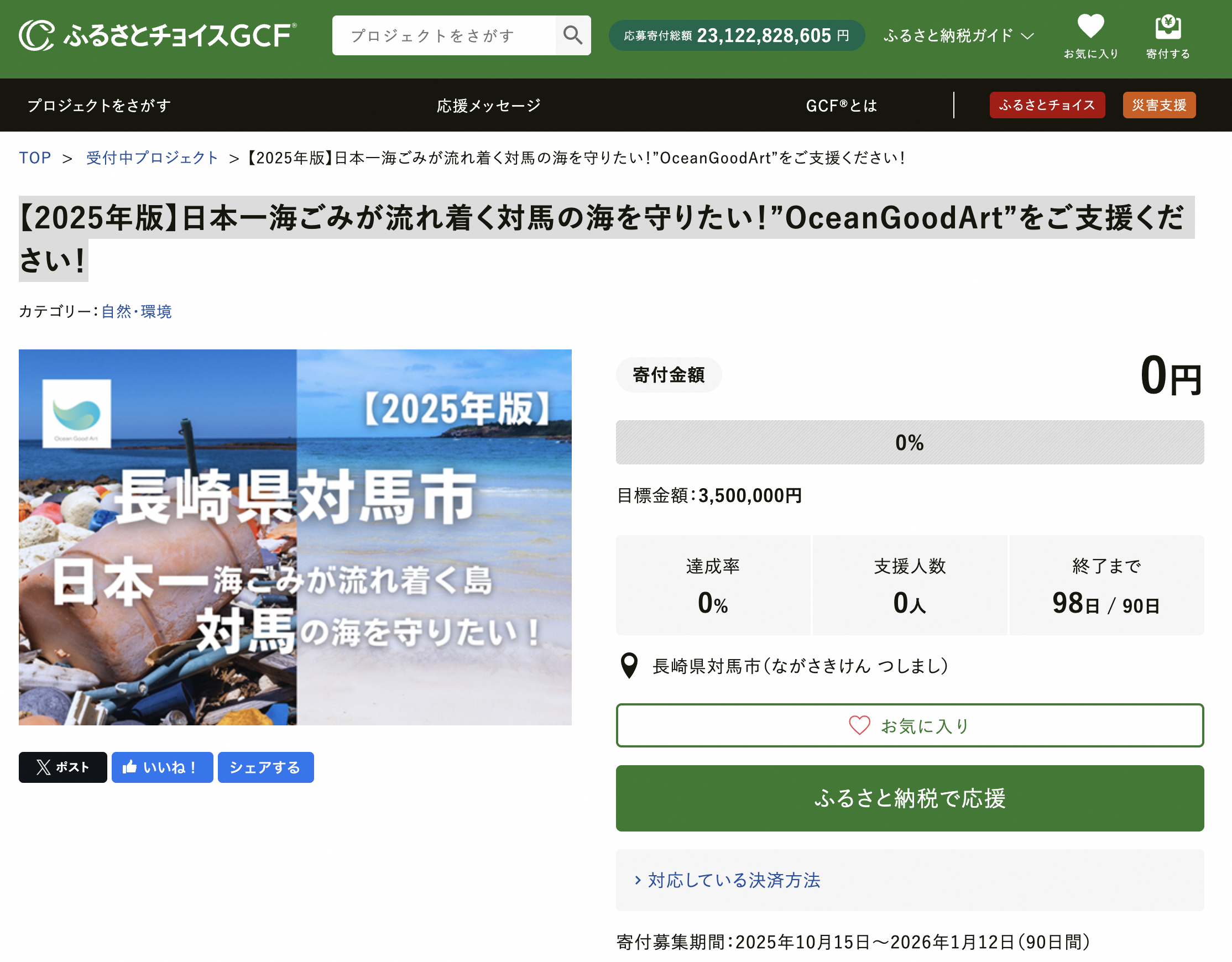 ◆プロジェクト名: 【2025年版】日本一海ごみが流れ着く対馬の海を守りたい!”OceanGoodArt”をご支援ください!