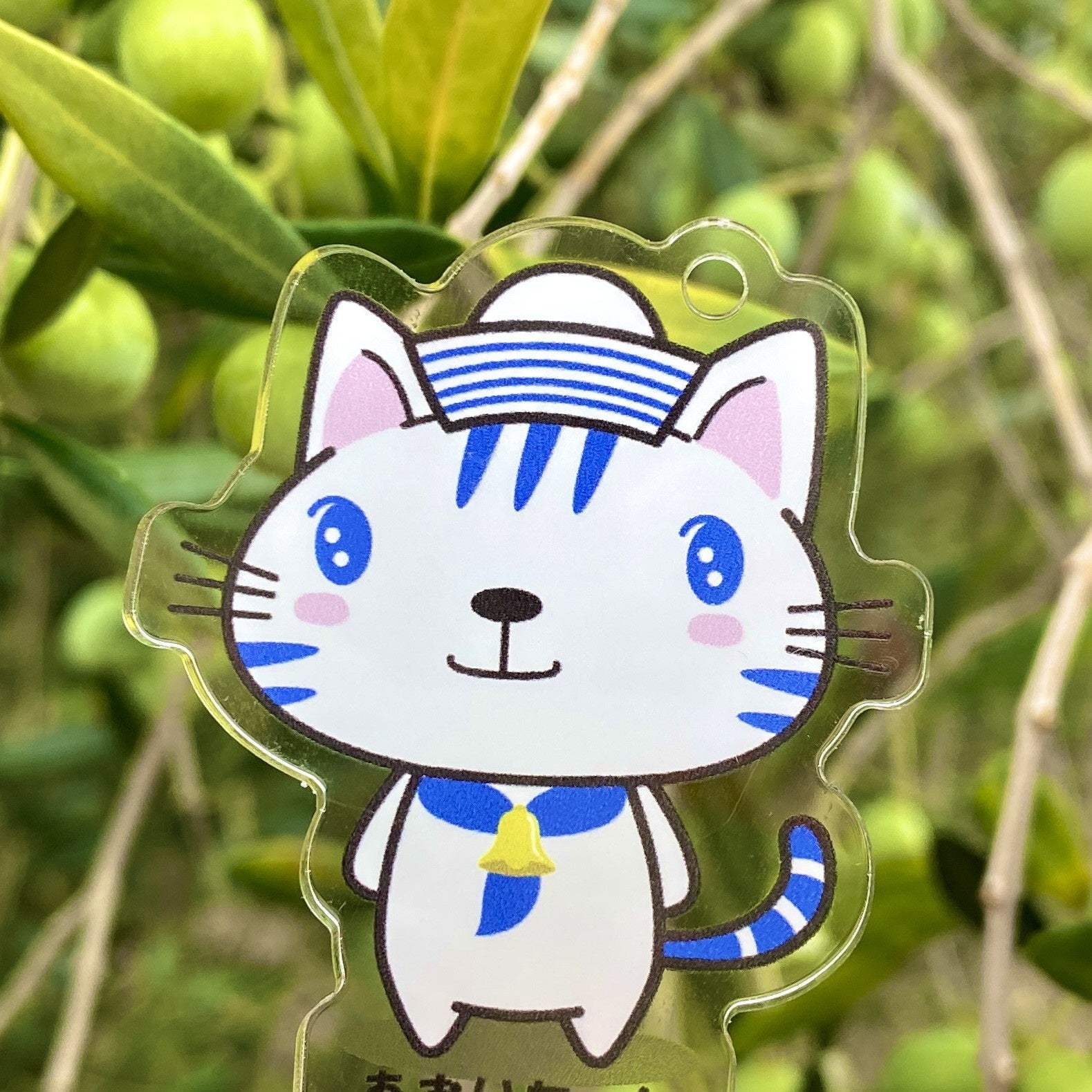 台座にはフェリー「あおい」の写真をプリント。取り外し可能なボールチェーン付きで、飾っても持ち歩いても楽しめるアイテムです。