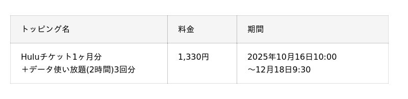 KDDI、沖縄セルラーは2025年10月16日から、povo2.0の「コラボトッピング」として、「Huluチケット1ヶ月分」と「データ使い放題(2時間)3回分」(注)がセットになったトッピングを1,330円で提供します。