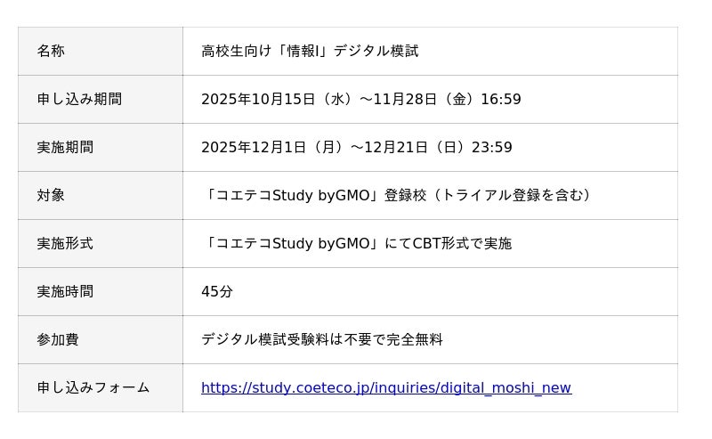 GMOインターネットグループのGMOメディア株式会社(代表取締役社長:森 輝幸 以下、GMOメディア)は、2025年1月から大学入学共通テストに本格導入された新科目「情報I」対策として、高校生を対象としたデジタル模試を2025年12月1日(月)~12月21日(日)に完全無料で開催いたします。