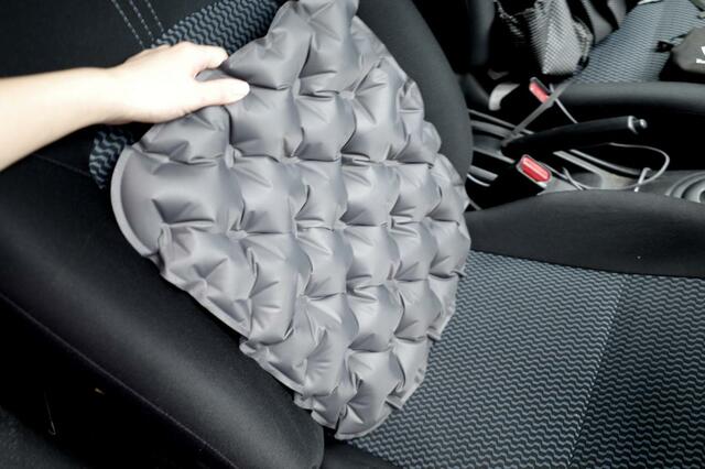 膨らませた「ポケット尻クッション お尻がふわっ!」を車の運転席に乗せてみると、座面のサイズにジャストフィット。座るとふわっとお尻がサポートされて、快適です。