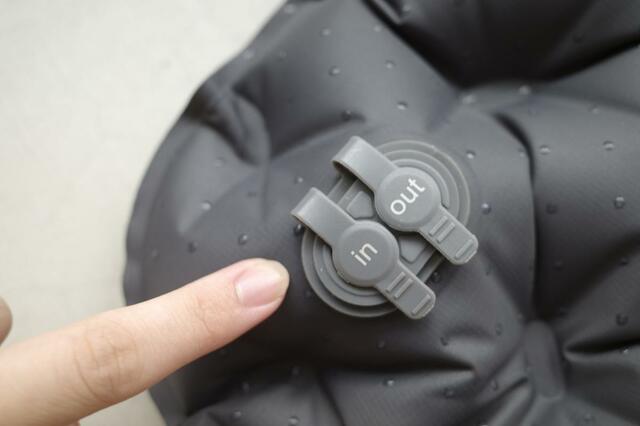 膨らませる際は「in」のバルブを開けて数回吹き込むだけでパンパンに膨らみます。私の場合は3吹もすれば十分。